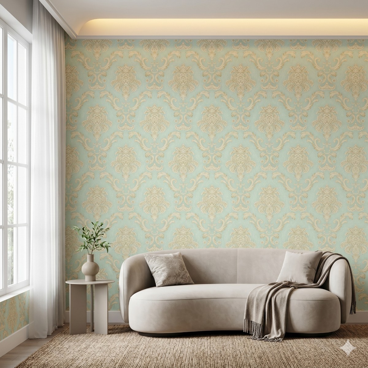 Papel De Parede Importado Lavável Azul Arabesco Bege