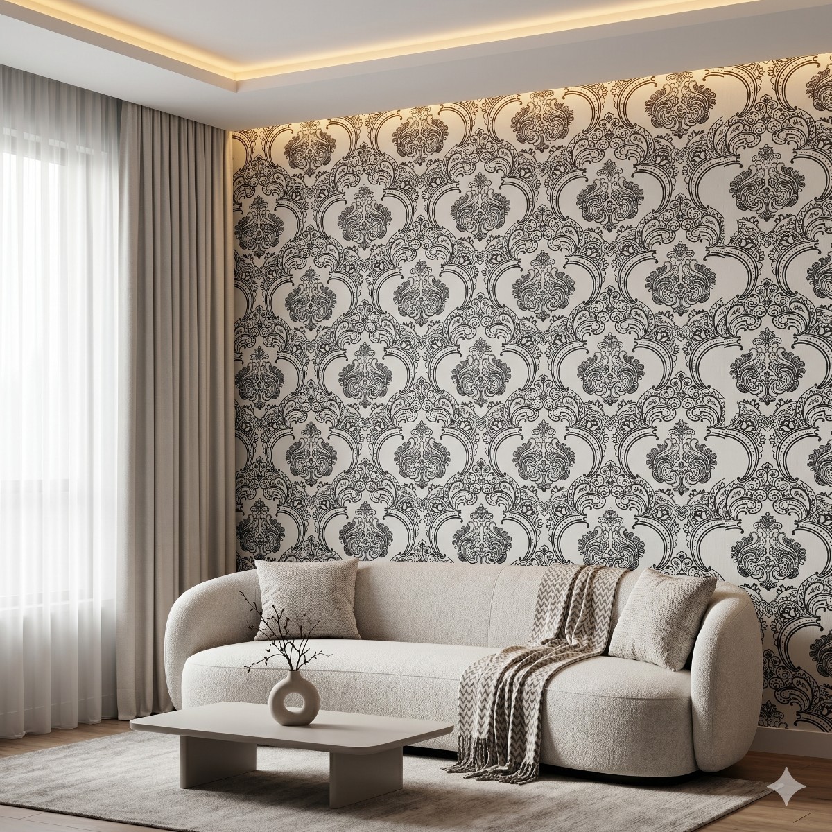Papel De Parede Importado Lavável Off White Arabescos Preto