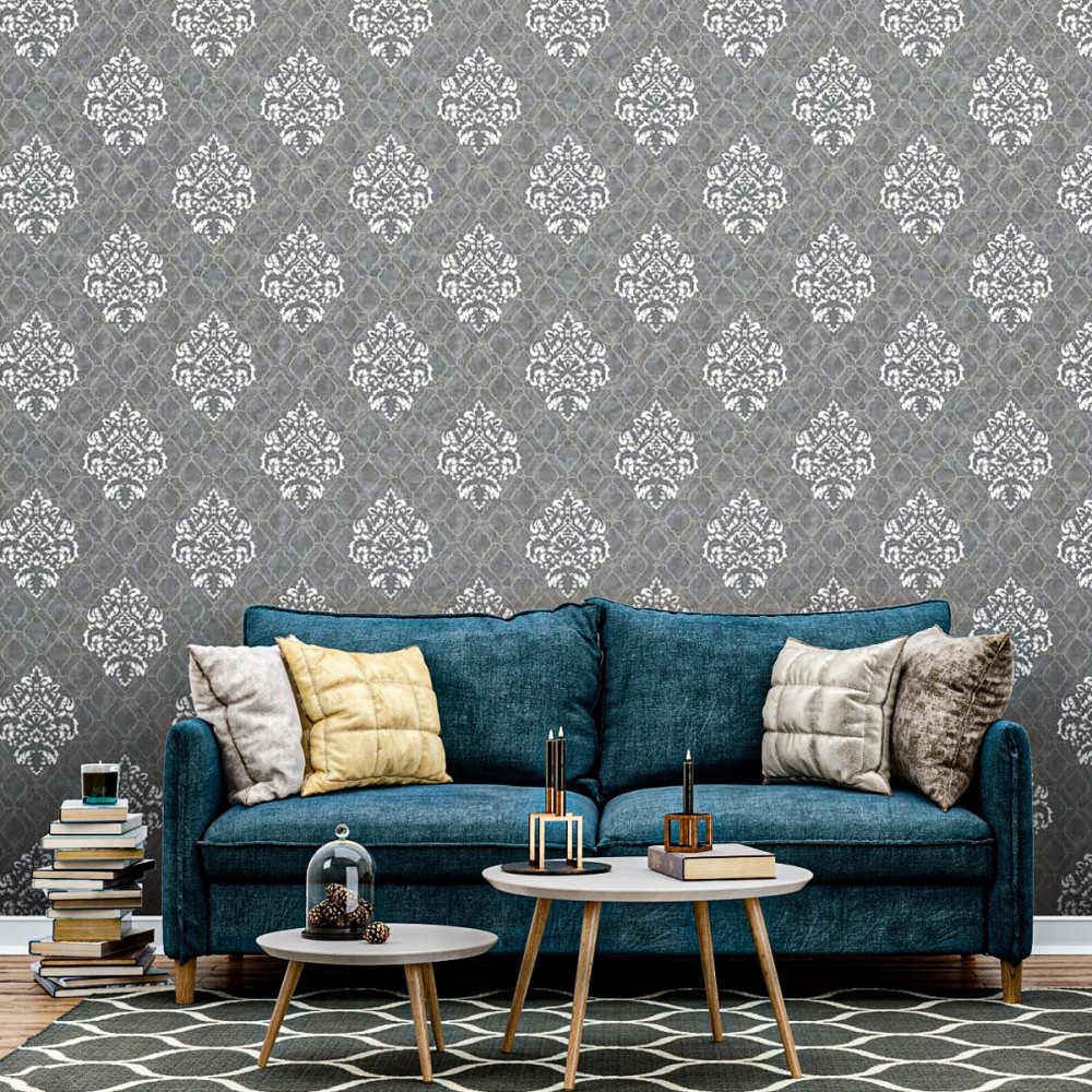 Papel De Parede Importado Texturizado Cinza Médio Arabesco