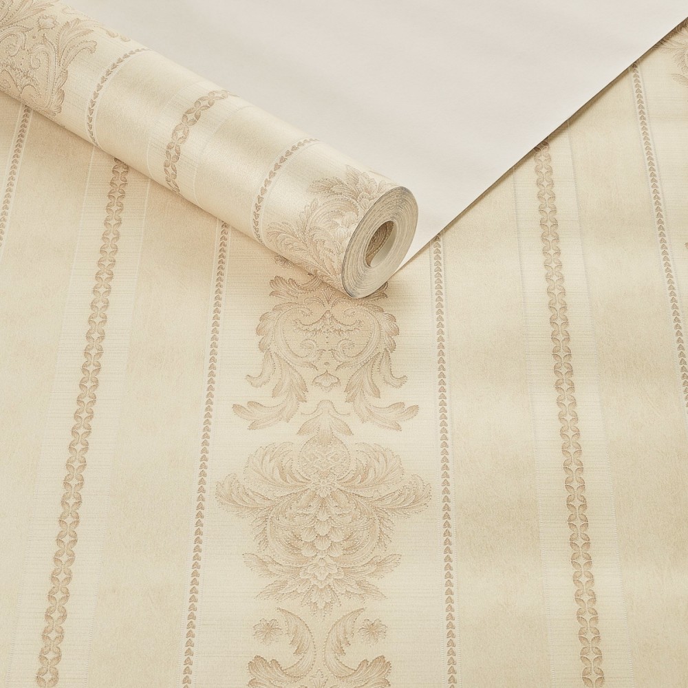 Papel De Parede Texturizado Listrado Arabesco Bege Com Brilho
